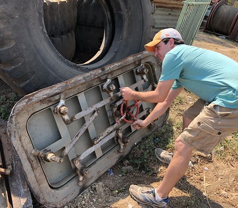 ![]() it's not ship salvage, but the pilot in him can't resist poking around this jet engine... |