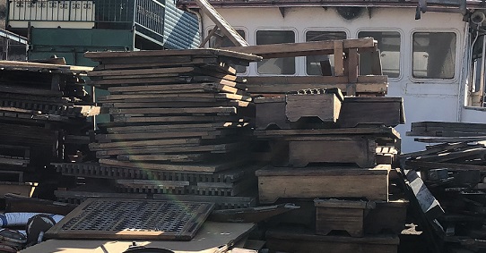 Buying Trip November 2019: This year's visit to the ship breaking yard in India and to the wood carvers for custom figureheads and reclaimed boat wood furniture in Indonesia was a great success. We also took a detour for fun to Philippines! *MOST ITEMS SALVAGED ON THIS TRIP ARRIVED IN-STORE APRIL 2020... Watch the "New Arrivals" section near the top of the homepage for alerts of recent shipments - OR join our email list to received notice when the shipments come in! Vessel salvage include pieces from (but not limited to) the following ships (scrapped, retro or refitted or renamed): Altus Optimus - Monrovia (IMO 8322662), Cassendra - Panama, MG Shipping - Tokyo (IMO 9052343), ATP Innovator - Houston (IMO 8754633), Alexita Spirit - Panama (IMO 9152507), WAN HAI 206 - Palau (IMO 9002702), Ocean Spur - Marshall Isl (IMO 8753275), Clara Maersk - Kiribati (IMO 8820016), MV Chengtu - Hong Kong (IMO 9007362), MV APL Korea - Palau (IMO 9074535), NSS Confidence - Panama (IMO 9181625), MV Island Escape (aka Ocean Gala / Thomson Spirit) - Malta (IMO 8024014), Harbour Ivory - Kuching (IMO 8887959), Bet Intruder - Douglas (ISLE OF MAN) IMO 9061564 |
