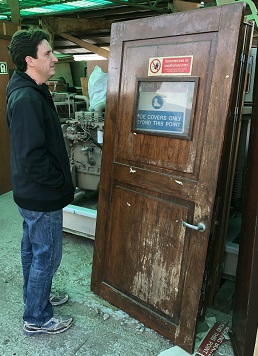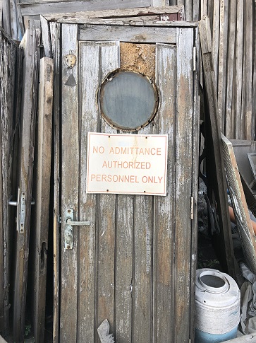 Another rough ship door. This one's brass deadlight was pilfered most likely to a scrapper for the raw brass value. |