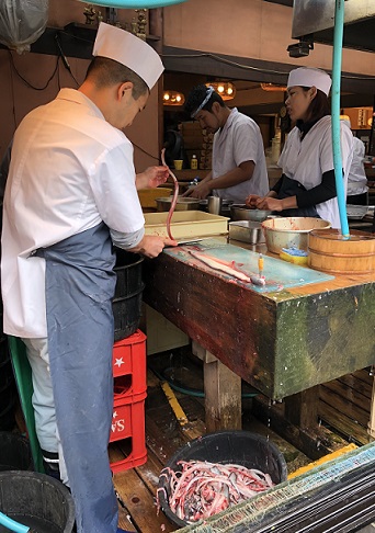 passing another boat; the only light is by headlamp from the captain |