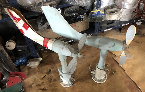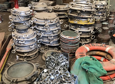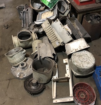 Foundry visit: All the "new production" lights we design, manufacture and carry are made from reclaimed materials from ships. Shown here are various pieces of aluminum sourced from the breaking yards which will be melted down and reused in our new production lighting. |