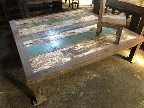 reclaimed boatwood large square table... it's a low rider but very unique |