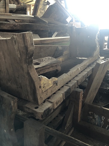 ![]() we found a good example of where some of our "rustic boatwood small stools" are salvaged from the boats; note the flat shelf-like part near the stern; that is what is used for the stool top and the holes in the stool are where the upright members went |