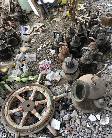 Another pile of good stuff we're brining back; a ship's wheel, nice lifeboat compass / lifeboat binnacle, an onion lifeboat lantern and some cool old railroad lights. |