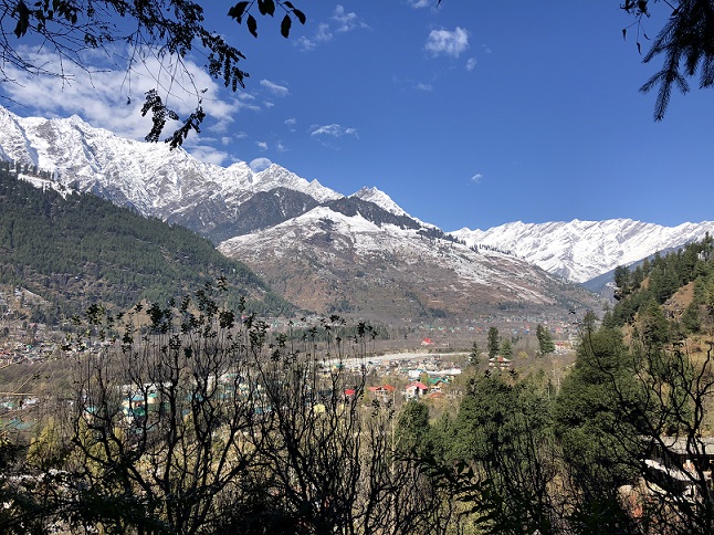 ![]() the Himalayan mountains behind one of the Vashisht Village temples near Jogini Falls in Manali |