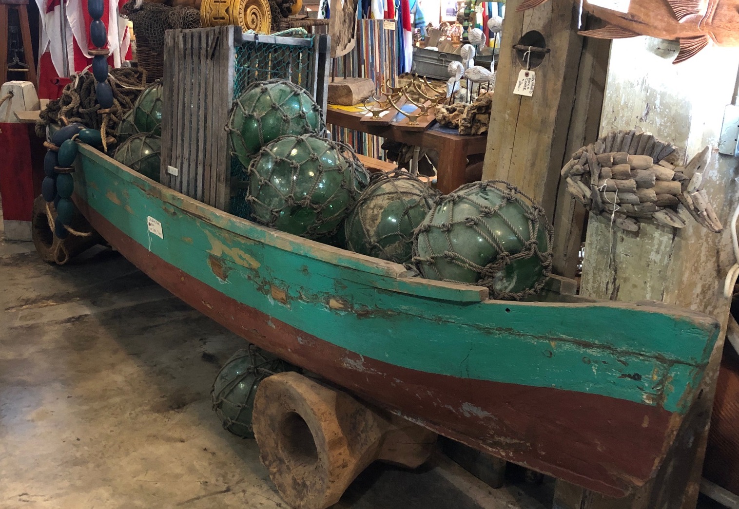 ![]() salvaged original authentic, hand-blown glass fishing net floats in a 13' dugout canoe / reclaimed boat |