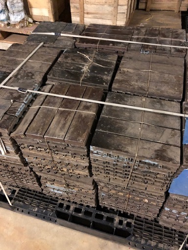 ![]() salvaged ship's deck tiles: interlocking 4-slat style wood flooring on backer / underlay (INV# 28) appx 12x12" sections. sold out |