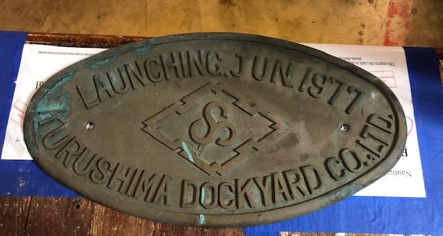 ![]() salvaged brass ships builder plate (Japan) Kurushima Dockyard Co. Ltd Launching Nov. 1977 Appx 21 1/2" x 11 1/2", 16 lbs, 1 available ($650) |