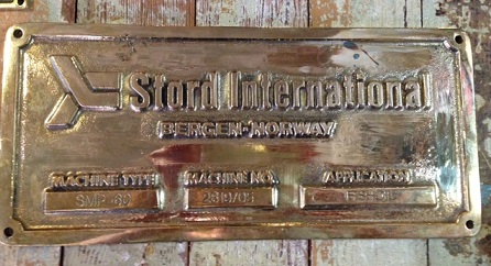 ![]() salvaged brass machine plate: Stord International Bergen - Norway - Machine No 2619/05 - Application Fishoil appx 12 3/4" x 5 3/4" available ($300) |