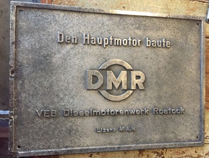 ![]() salvaged German origin aluminum builder plate: DMR Den Hauptmotor baute VEB Dieselmotorenwerk Rostock Lizenz M.A.N. appx 16 1/2" x 11 3/4" available ($200) |