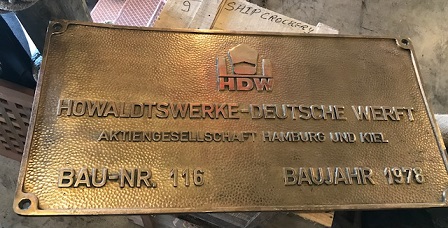 ![]() salvaged brass builder plate: Howaldtswerke-Deutsche Werft Aktiengesellschaft Hamburg Und Kiel; BAU-NR. 116 Baujahr 1978, appx 33" x 16 1/2" 1 available ($1000) |