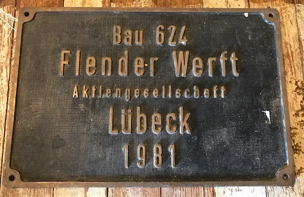 ![]() salvaged brass builder plate, Bau (construction) 624 17 3/4" x 12" Flender Werft Lubeck 1981 *this company, headquartered in Germany, made war-ships, merchant ships and U-boats; went out of business 2002 appx 14 lbs; 1 available ($800) |