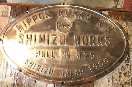 ![]() salvaged brass builder plate: Nippon Kokan K.K. Shimizu Works, Hull No. 425 Shimizu Japan 1985 appx 23 1/2" x 15 3/4" 1 available ($850) |