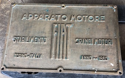 ![]() salvaged brass builder plate: Apparato Motore Stabilimento Torino - Italia (Turin, Italy) Grandi Motori - Anno 1960, appx 37 x 23", 102 lbs available ($1500) |