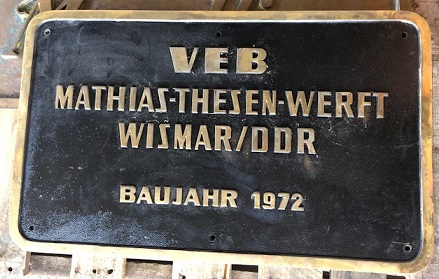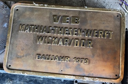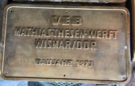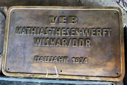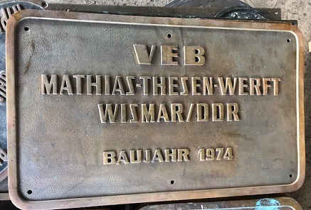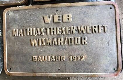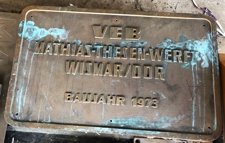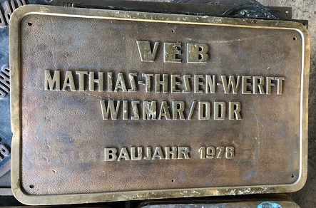 ![]() salvaged brass builder plate VEB Mathias - Thesen - Werft Wismar/DDR Baujahr 1978 44 lbs: 1 available ($550) |