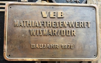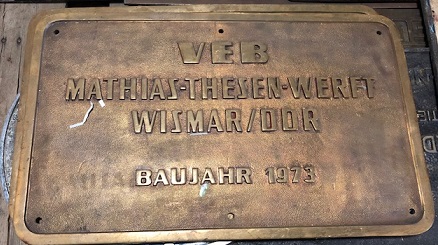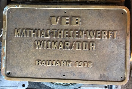 ![]() salvaged brass builder plate VEB Mathias - Thesen - Werft Wismar/DDR Baujahr 1979 43 lbs: 1 available ($550) |