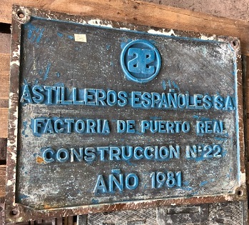 ![]() salvaged brass builder plate: (Spain) Astilleros Espanoles S.A. Factoria De Puerto Real - Construccion No. 22, Ano 1981 appx 23.5" x 31.5", 90 lbs available ($700) |