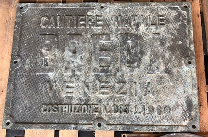 ![]() salvaged large brass builder plate Cantiere Navale BREDA Venezia (Italy) Costruzione No. 283, A. 1980 *shadow only; digits scraped appx 25" x 35", 122 lbs available ($1200) |