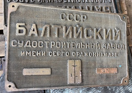 ![]() salvaged brass builder plate: Baltic Shipbuilding Plant (Soviet Union) CCCP - Serial No. 629, dated 1971 appx 30" x 19" 87 lbs: 1 available ($1500) |
