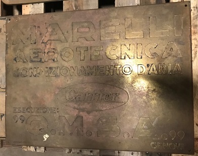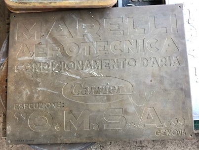 ![]() salvaged Italian brass Carrier builder plate by Marelli Aerotecnica Condizionamento D'aria Esecuzione, "O.M.S.A." Genova. appx 27x20", 14 lbs: 1 (B) available ($200) |