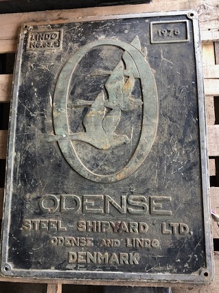 ![]() salvaged brass builder yard plate Odense Steel Shipyard, LTD Odense and Lindo Odense Steel Shipyard Ltd. 1978 Odense and Lindo - Denmark. Lindø Yard Name Plate No. 63.2 appx 22 x 30", 73 lbs: 1 available ($1400) |
