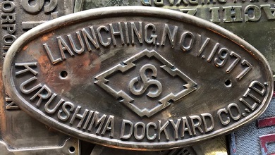 ![]() salvaged brass ships builder plate (Japan) Kurushima Dockyard Co. Ltd Launching Jun. 1977 - Appx 21 1/2" x 11 1/2", 16 lbs, 1 available ($650) |