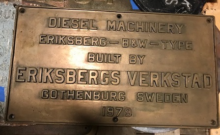 ![]() salvaged brass builder plate *possibly salvaged from IMO #7716660 Saint Roland (former vessel names include Roxane Delmas, Robert, Grand Bassam, Saint Roland, Bullaren, Tarifa) per former crew member Diesel Machinery - Eriksberg - B&W Eriksbergs Verkstad, Gothenburg Sweden 1979 appx 27" x 15", 38 lbs: 1 available ($900) |