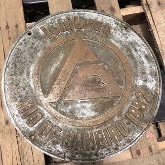 ![]() salvaged brass builder plate (Brazil) Ishibras, Rio de Janeiro, 1982 appx 20" diameter 39 lbs: 1 available ($700) |