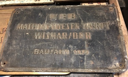 ![]() salvaged brass builder plate VEB Mathias - Thesen - Werft Wismar/DDR Baujahr 1979 40 lbs: (BLACK) 1 available ($550) |