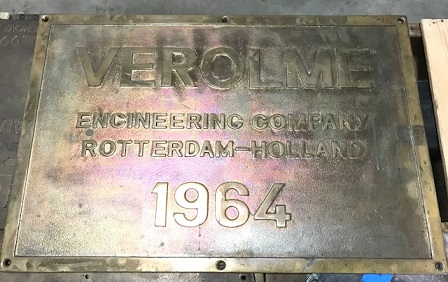 ![]() salvaged brass builder plate Verolme Engineering Company Rotterdam - Holland 1964 appx 23" x 35", 66 lbs available ($950) |