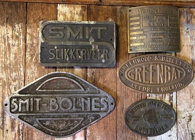 ![]() salvaged medium brass placards: Smit Slikkerveer (Ridderker, Netherlands) - appx 4 3/4" x 8":2 available ($150/each) |