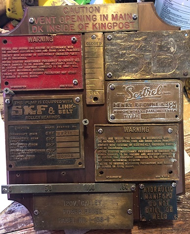 )![]() salvaged small (appx 2x4" "Warning") brass placards (clockwise from top): Caution Vent Opening in Main Dk Inside of Kingpost. sold out. Warning - Made in USA. sold out 120V Galley Power Panel available ($25) SKF & Link-Belt Roller Bearings available ($40) |