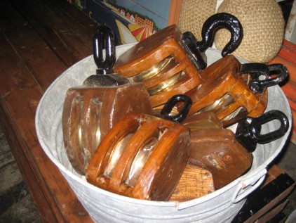 (CLICK HERE): Most have been reconditioned, stripped and polished. These come to us in a variety of sizes, some with hooks, eyes, beckets, etc and some without. Single wheeled, double sheaved (wheels) and occasionally a triple or more here and there... ...and deadeyes. |