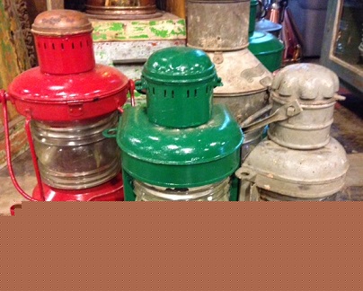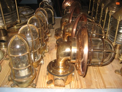 Lights & Lanterns (CLICK HERE): Salvaged from merchant marine and cruise ships, lighting on board varied in size, material (galvanized steel, brass, copper, aluminum), and type (electric running lights, oil burning lanterns, etc.) ![]() Large sized copper and brass salvaged fox lights / cargo lights. |