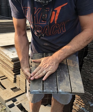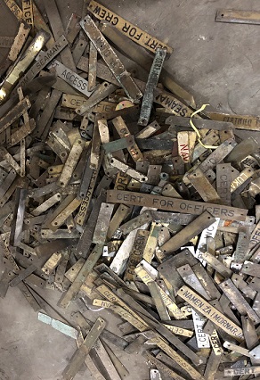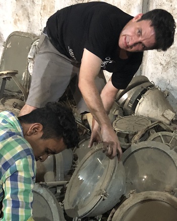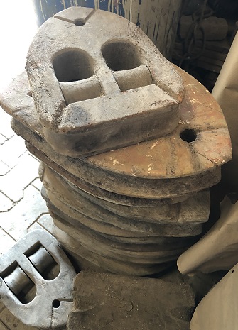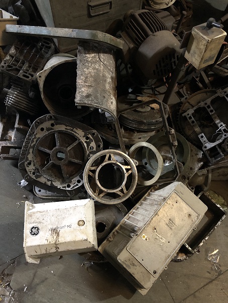 Foundry visit: All the "new production" lights we design, manufacture and carry are made from reclaimed materials from ships. Shown here are various pieces of aluminum sourced from the breaking yards which will be melted down and reused in our new production lighting. |