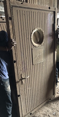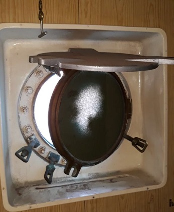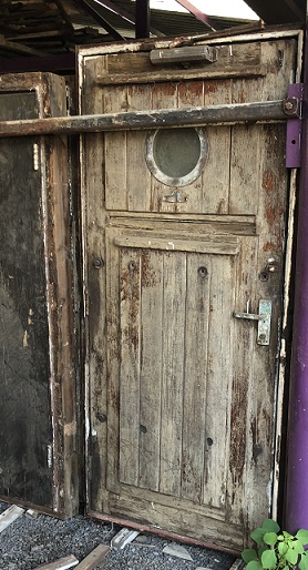 Another rough ship door. This one's brass deadlight was pilfered most likely to a scrapper for the raw brass value. |