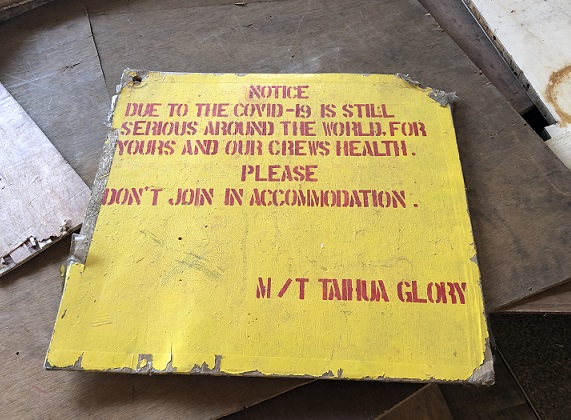 "Notice: Due to the Covid-19 is still serious around the world, for yours and our crews health. Please don't join in accomodation. - M/T Taihua Glory" placard salvaged from said chemical/oil tanker vessel... IMO #9114505 |