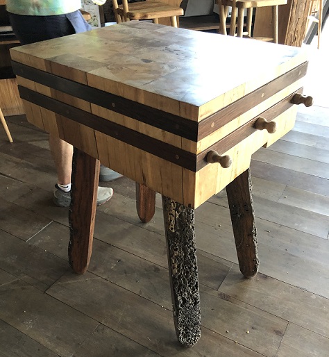 reclaimed boatwood large square table... it's a low rider but very unique |