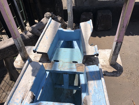 ![]() we found a good example of where some of our "rustic boatwood small stools" are salvaged from the boats; note the flat shelf-like part near the stern; that is what is used for the stool top and the holes in the stool are where the upright members went |