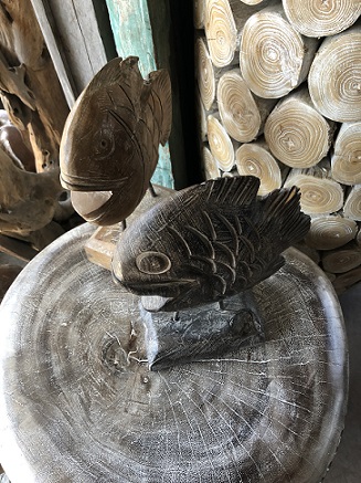hand carved teak root "happy fish" on stand - due in store April 2020 |