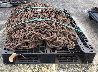 ![]() salvaged stud link anchor chain: 3 1/8" links (mixed with 3 3/8"), INV #74/1 (404kg, 890 lbs) *we can cut your custom length; $25 cut fee per cut, most lengths available ($3 per link) |