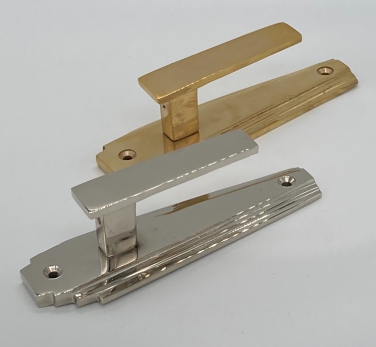 ![]() new production Art Deco-inspired hooks: Charleston (nickel plated brass) : 5 1/8" total length, 1 1/2" widest, 1 1/2" depth from back of plate to front face of bar, hole pattern 4 1/8" center to center |