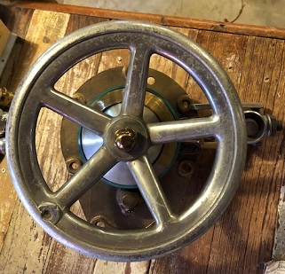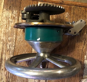 ![]() salvaged small aluminum with brass components German geared valve wheel (placards read Leer = "empty", Lauf = "run" Vollast = "full load", Kupplung Ein = "clutch on", Kupplung Aus = "clutch off") appx 10" diameter, 8" total depth, 13" width overall |