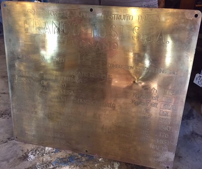 ![]() salvaged brass builder plate: Apparato Motore Stabilimento Torino - Italia (Turin, Italy) Grandi Motori - Anno 1960, appx 37 x 23", 102 lbs available ($1500) |