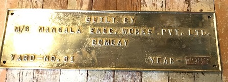 ![]() salvaged brass builder plate 27" x 7 1/2" Built By M/S Mangala Engg. Works, PVT.Ltd. Bombay - Yard-No. 81 Year - 1983 1 available ($650) |