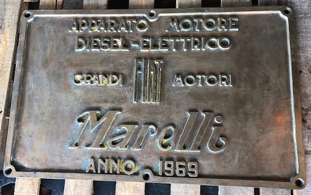 ![]() salvaged brass Italian parts company plate: (Italy) Apparato Motore Diesel Elettrico (Electric Diesel Engine Apparatus) Fiat - Marelli - Grandi Motori - 1969, appx 37.5 x 23", 88 lbs available ($1300) |