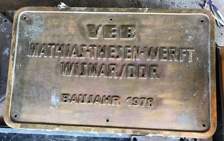 ![]() salvaged brass builder plate VEB Mathias - Thesen - Werft Wismar/DDR Baujahr 1979 43 lbs: 1 available ($550) |