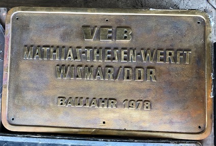 ![]() salvaged brass builder plate VEB Mathias - Thesen - Werft Wismar/DDR Baujahr 1978 44 lbs: 1 available ($550) |