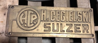 ![]() salvaged brass builder plate (Poland) (Poznań, Poland) (aka Ceglorz) H. Cegielski - Sulzer (Sulzer = Swiss diesel engines) appx 20 x 7" 11-13 lbs: |