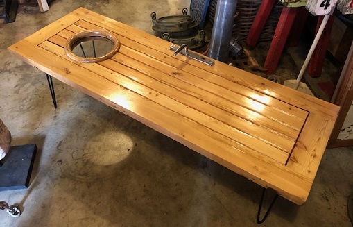 salvaged Turkish ferry boat door COFFEE TABLE; wood framed porthole / deadlight window appx 58 1/2" x 24" x 18" tall, appx 45 lbs.sold out |